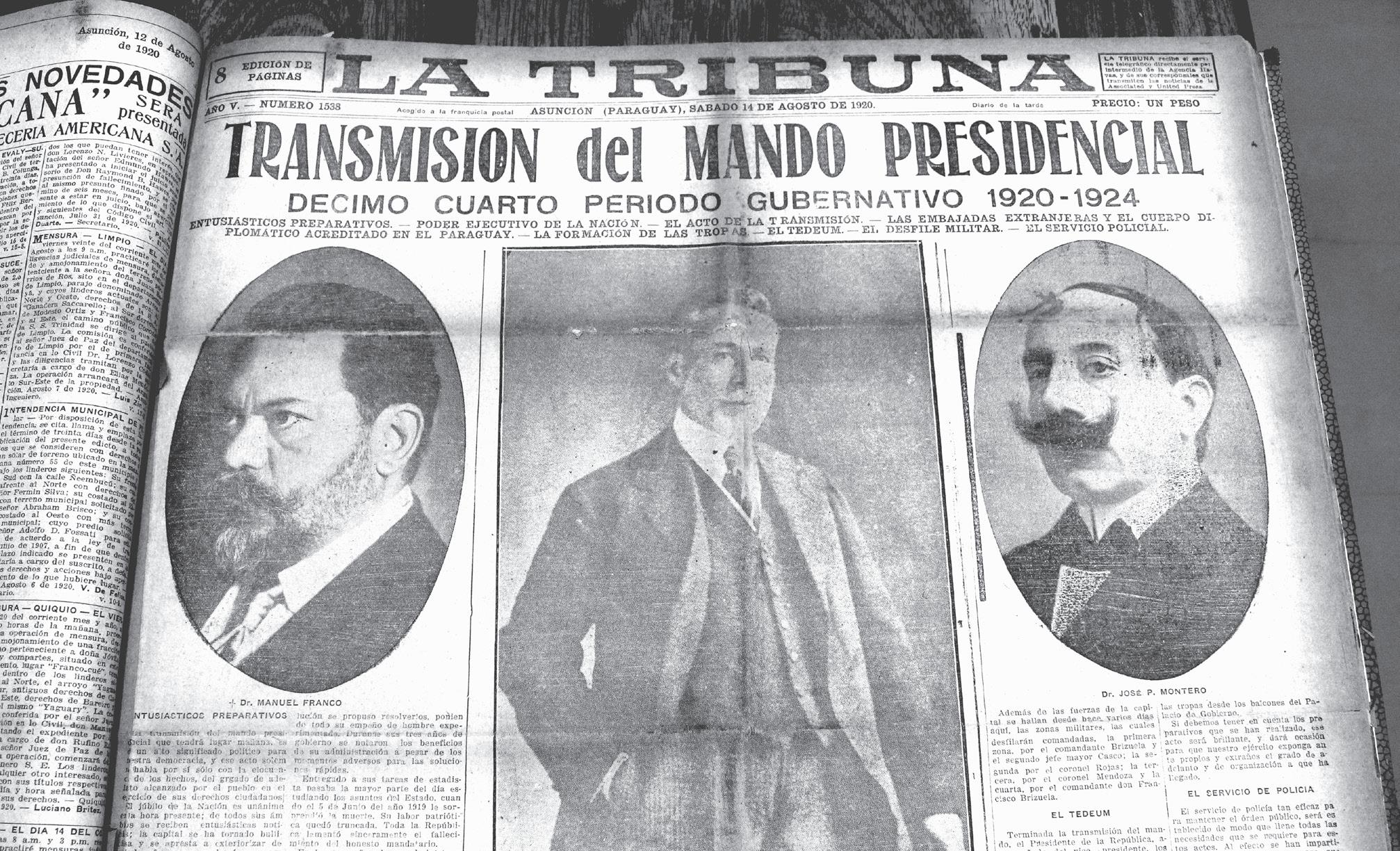 Al igual que lo que ocurrirá el próximo martes 15 de agosto, cuando asuma el presidente electo, Santiago Peña, hace 103 años una idéntica ceremonia se desarrolló en una fecha similar. P. 33