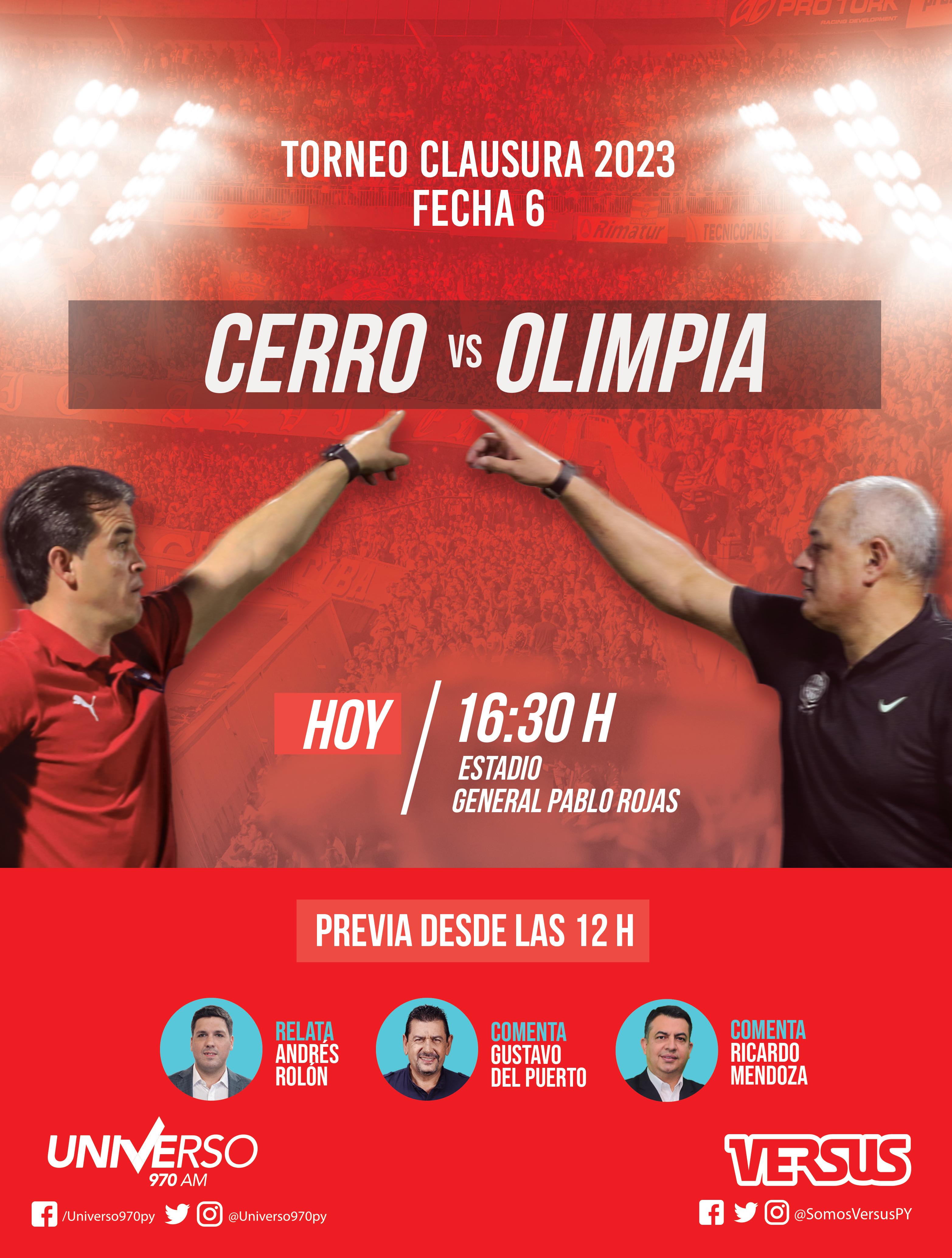 SUPERCLÁSICO 4-4-2 General Pablo Rojas (La Olla) 16:30 403 Anotó Cerro Porteño 408 Anotó Olimpia ALEJANDRO SILVA JEAN FERNANDES JUAN ESPÍNOLA 319 PARTIDOS (1913-2023) 112 VICTORIAS DEL CICLÓN 97 EMPATES 110 TRIUNFOS DEL FRANJEADO TV: En vivo por Tigo Sports EDUARDO BROCK JORGE MOREL ALAN BENÍTEZ FEDERICO CARRIZO DAMIÁN BOBADILLA RAFAEL CARRASCAL GIMÉNEZ O VERA DIEGO CHURÍN DOMÍNGUEZ U OVIEDO JÚNIOR BARRETO MATEO GAMARRA FACUNDO ZABALA FERNANDO CARDOZO RICHARD ORTIZ RAMÓN MARTÍNEZ IVÁN TORRES ALAN CANO FACUNDO BRUERA 4-4-2