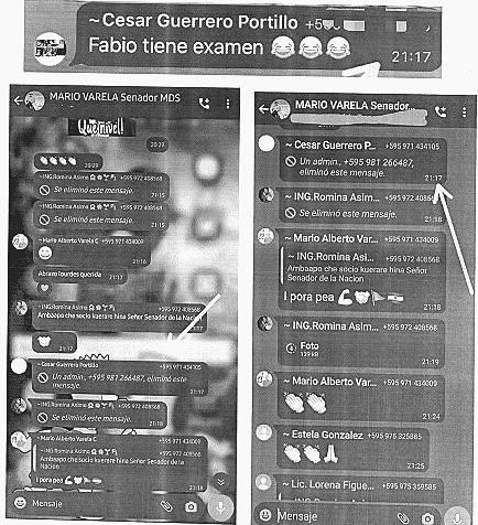 En un grupo de Whatsapp político del hoy senador Mario Varela junto con altos funcionarios del Ministerio de Desarrollo Social (MDS) leales al mismo, entre los que se pueden citar a la directora de Gestión de Personas, Lorena Escalante; el viceministro de Protección y Promoción Social, César Guerrero, mencionan en guaraní cómo están trabajando por “los socios” postulantes en el concurso de desprecarización para nombramientos en la institución. Al cierre administrativo, apuraron nombrar 250 asalariados y según denuncia, en conversación de Whatsapp intercambian las respuestas para los amigos a través del ex secretario general Fabio Candia.