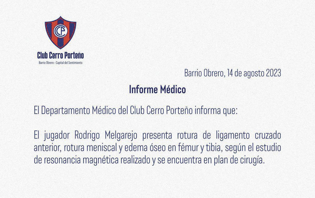 “El departamento médico del club Cerro Porteño informa que el jugador Rodrigo Melgarejo presenta rotura de ligamento cruzado anterior,