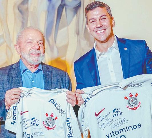 El futbolista paraguayo Ángel “Melli” Romero hizo llegar dos camisetas autografiadas del Corinthians a los presidentes de Paraguay, Santiago Peña, y de Brasil, Lula da Silva, que fueron exhibidas por ambos durante los actos de asunción al mando presidencial en nuestro país. El mandatario brasileño es hincha fanático del Timão.