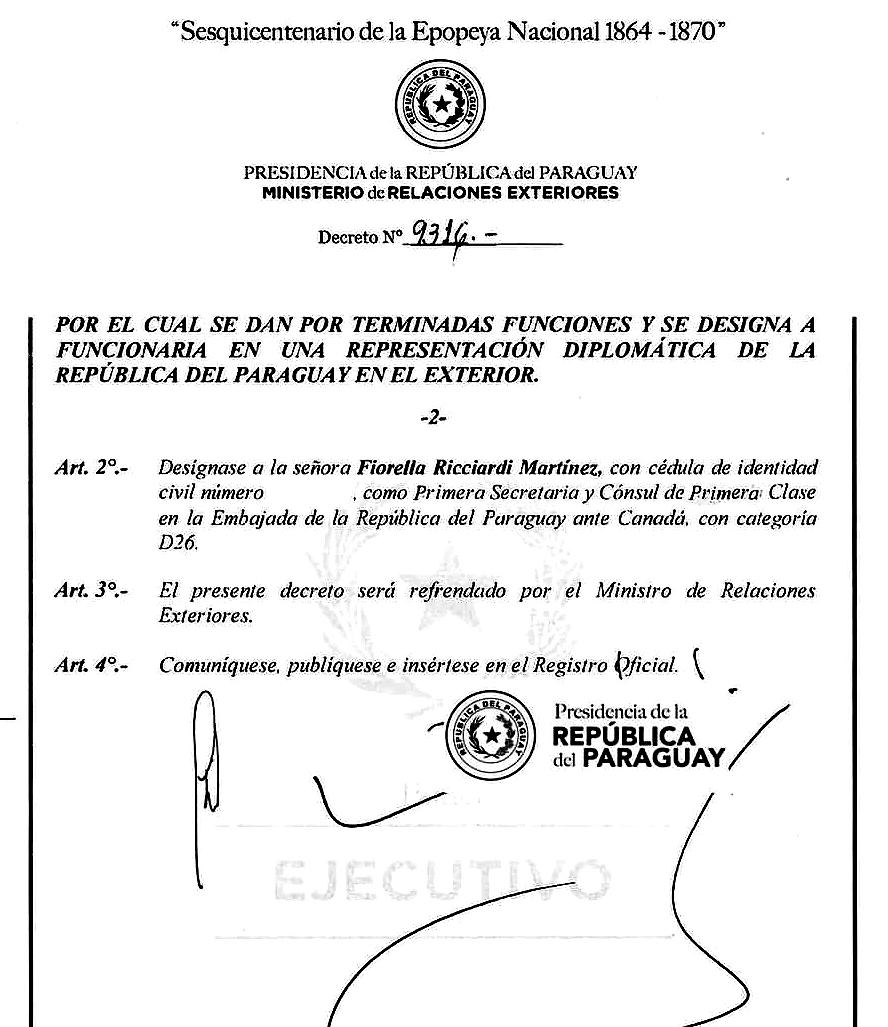 lla Ricciardi como representante diplomática de la República del Paraguay ante Canadá, como primera secretaria y cónsul de primera clase, con categoría D26.