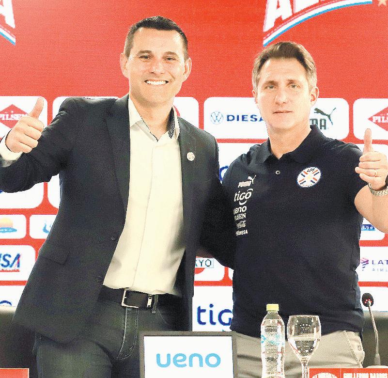 Guillermo Barros Schelotto y Justo Villar, director de selecciones, en la conferencia de prensa