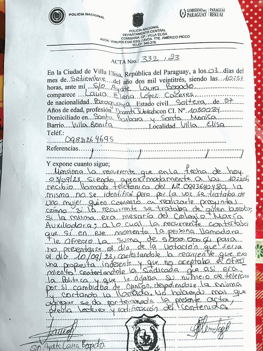 El domingo, la apoderada distrital del Partido Colorado en la localidad de Villa Elisa, Ada López, formalizó su denuncia ante la Comisaría n.º 13 de la mencionada localidad y en el Ministerio Público contra el equipo liberal del territorio. Alegó intento de extorsión a los miembros de mesa colorados con el objetivo de que estos se ausenten en las próximas elecciones municipales complementarias del domingo 10 de setiembre.