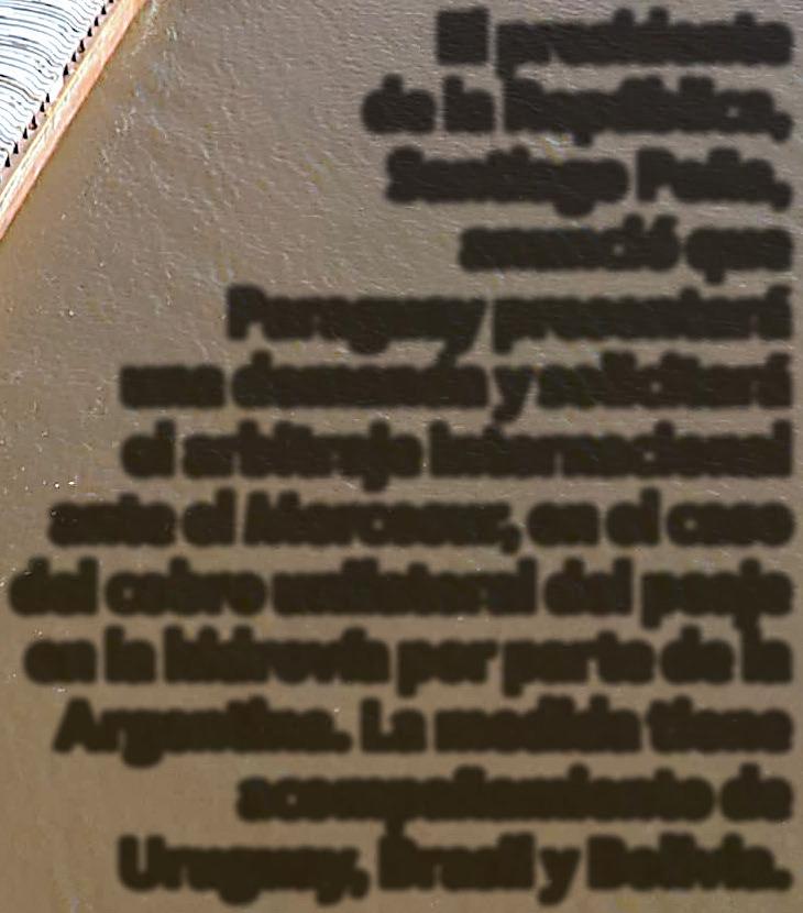 El presidente de la República, Santiago Peña, anunció que Paraguay presentará una demanda y solicitará el arbitraje internacional ante el Mercosur, en el caso del cobro unilateral del peaje en la hidrovía por parte de la Argentina. La medida tiene acompañamiento de Uruguay, Brasil y Bolivia.