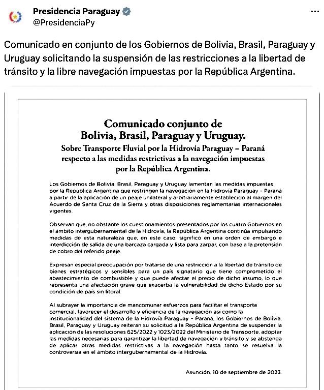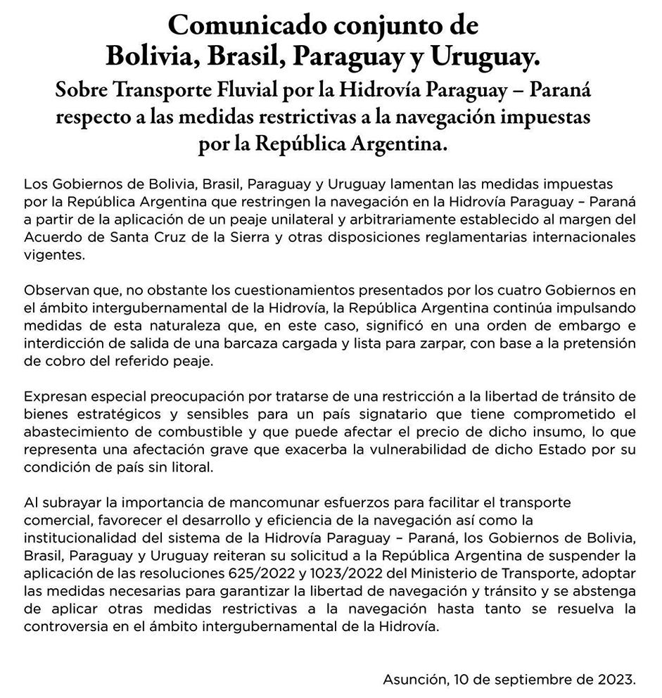 Los gobiernos de Bolivia, Brasil, Paraguay y Uruguay lamentan las medidas impuestas por la República Argentina que restringen la navegación en la hidrovía Paraguay – Paraná a partir de la aplicación de un peaje unilateral y arbitrariamente establecido al margen del Acuerdo de Santa