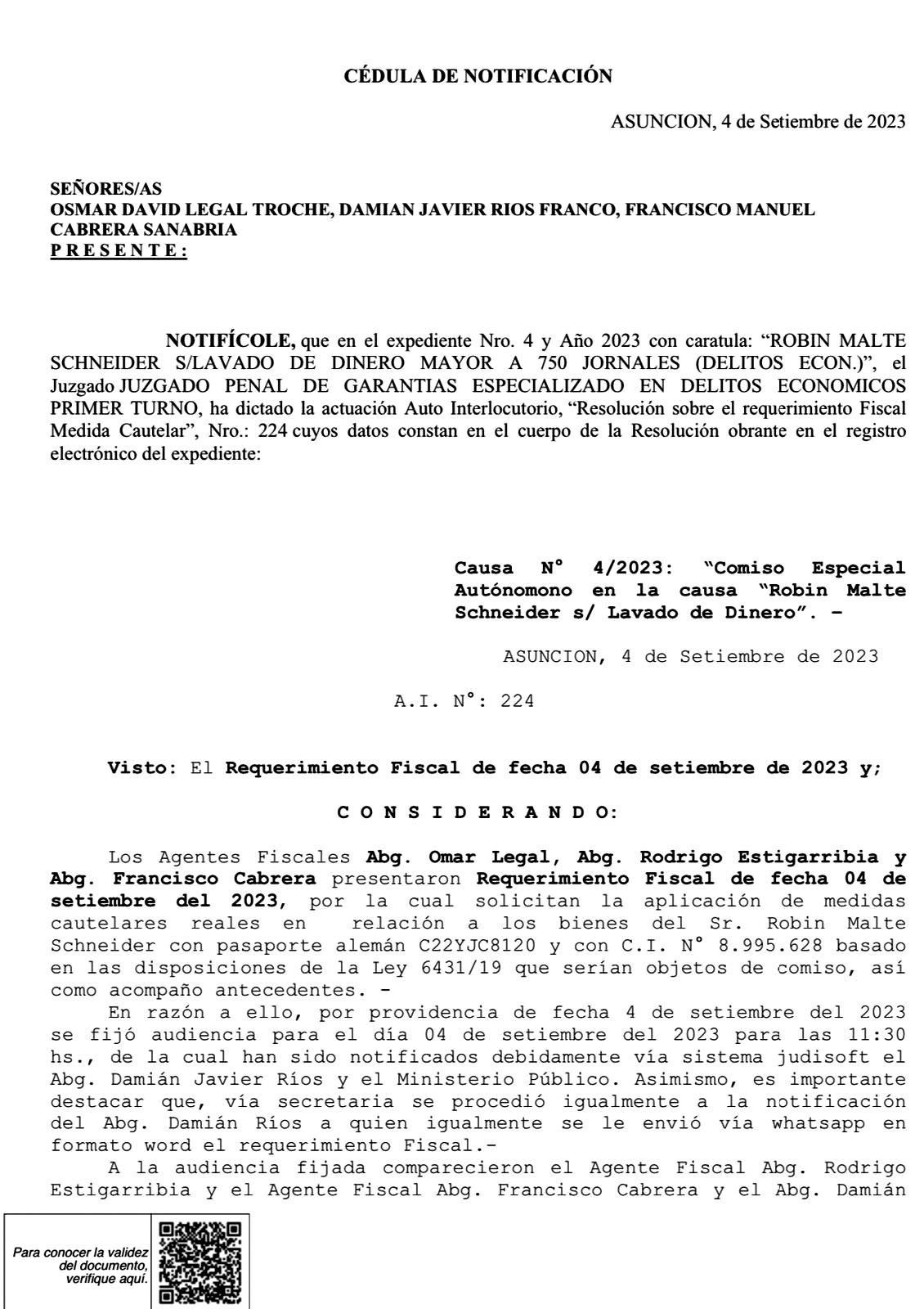 Esta es la cédula de notificación por la cual se disponen los embargos a los bienes del ciudadano alemán, vehículos, inmuebles y cuentas bancarias