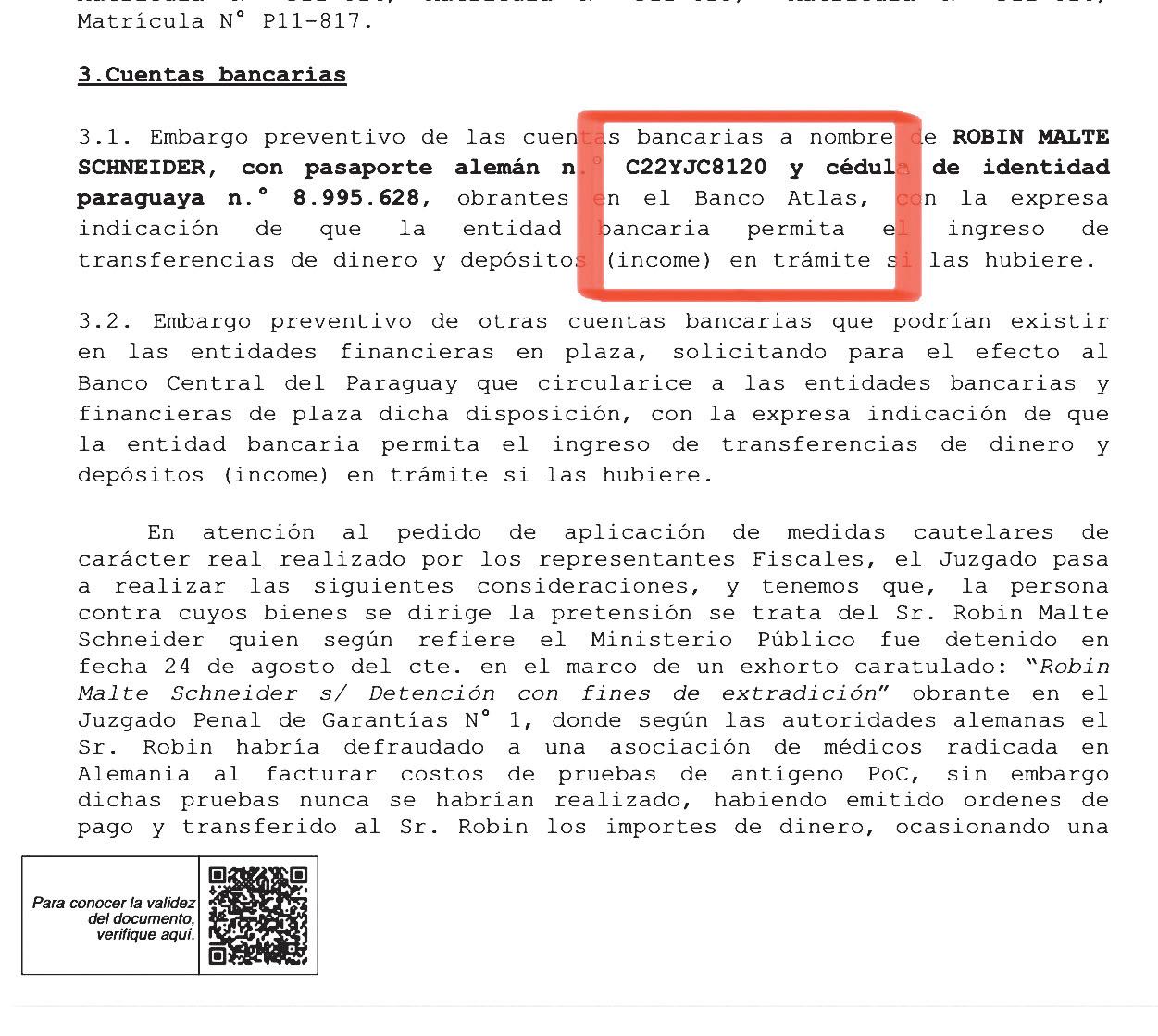 El fiscal Cabrera solicitó aplicar las medidas cautelares reales sobre los bienes muebles e inmuebles y cuentas bancarias que pertenecen a Robin Malte Schneider, quien habría defraudado a la mencionada asociación de médicos de seguro de salud de Baja Sajonia en Hannover (Alemania), al facturar costos de prueba de antígeno, que supuestamente habían sido realizadas, pero que, conforme con otros elementos, existen indicios de que nunca fueron llevadas a cabo, lo que habría ocasionado un perjuicio multimillonario.