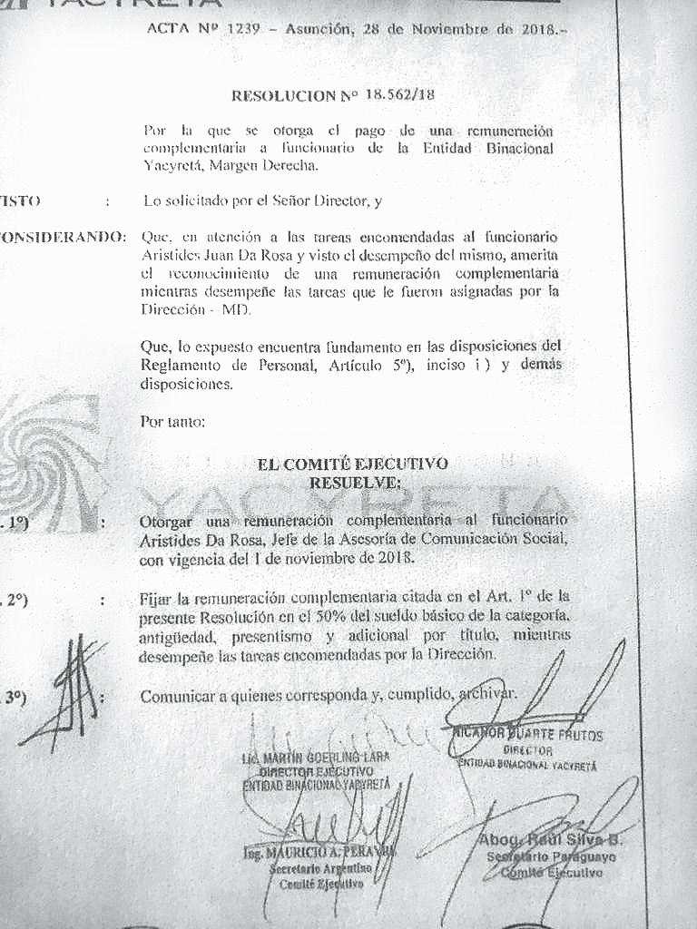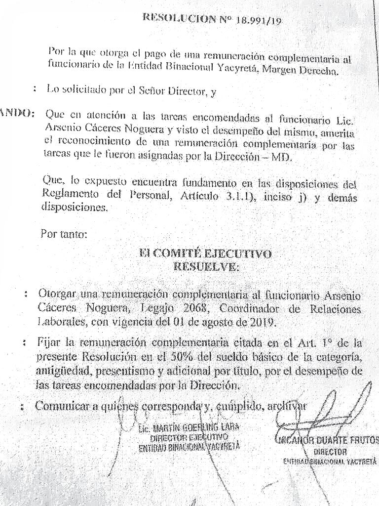En el caso del plus salarial la lista es larga. Pero los nombres ameritan ser conocidos, ya que la remuneración complementaria llegaba al 50 %: Arsenio Cáceres Noguera (coordinador de Relaciones Laborales), 22.488.665 guaraníes sobre “salarios y beneficios”; Juan Aristides da Rosa Cano, G. 20.124.824; Ronaldo Darío Rodríguez Olmedo, G. 16.680.335, y Alberto Ramón