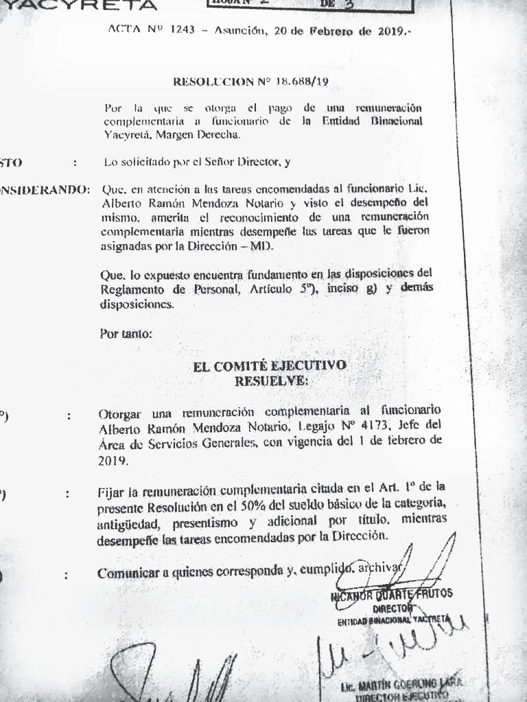 gentes se dejaron seducir por la verborrea demagógica del exdirector de Yacyretá Nicanor Duarte Frutos. Es lo más sano que podemos pensar. Porque durante la anterior administración hubo comisionados a doble vía: los que venían a la EBY y los que se iban a otras instituciones, sin describirse sus funciones, especialmente en municipalidades, donde no se conocía siquiera de su presencia, tal como hemos publicado con anterioridad. Antes del 15 de agosto, el que fuera secretario general paraguayo del Consejo de Administración, margen derecha, Pablino Acasio Rodríguez, renunció a su cargo (no a su sueldo) y fue comisionado a la Cámara de Diputados. Es lo que nos dijeron. Tenemos claramente registrados e identificados a los demás. Solo es cuestión de que los dirigentes sindicales pidan un informe, que es un documento de libre acceso público. Un funcionario de puertos tenía (o tiene) una gratificación de 6.000.000 de guaraníes; otro que vino del Ministerio de Tecnologías de la Información y Comunicación (Mitic), con un “extra” de 8.000.000 de guaraníes; una de la Cámara de Diputados, con 12.000.000 de guaraníes; de la Procuraduría General de la República, con 8.000.000. Y otras lindezas por el estilo.