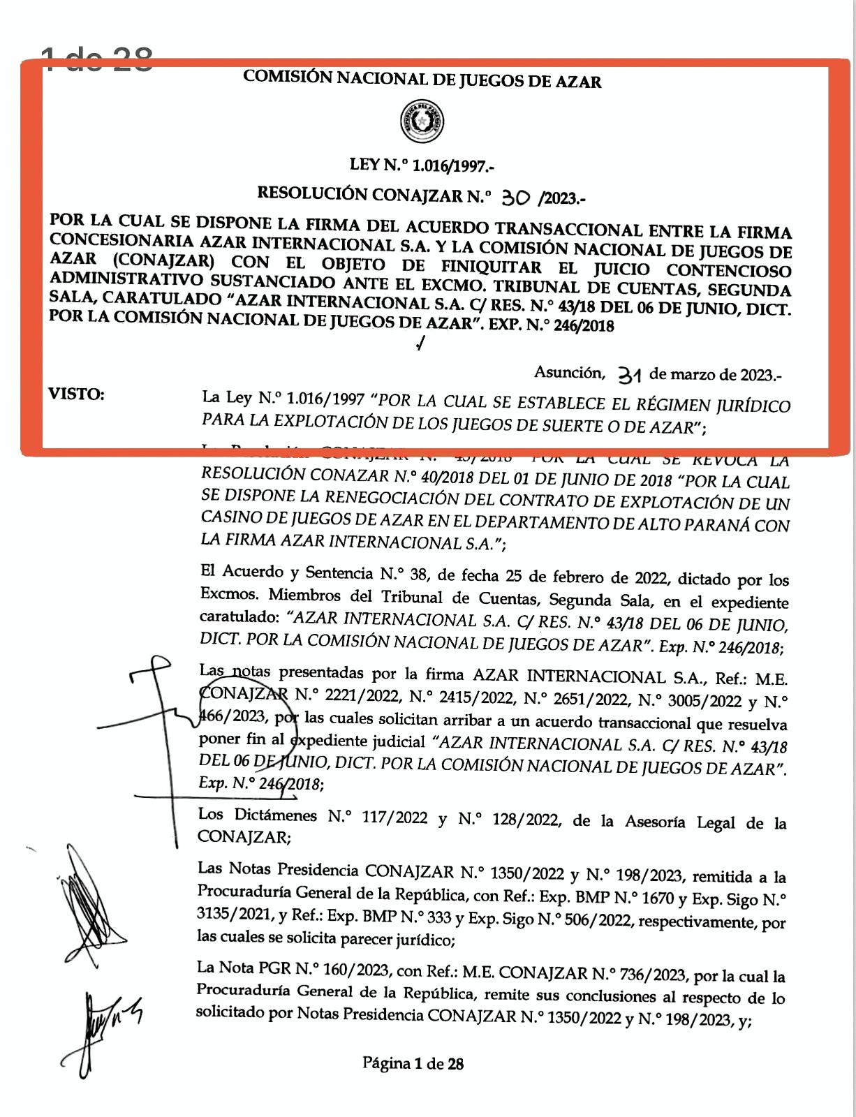 El 1 de junio de 2018, Conajzar dispuso renegociar el contrato de explotación del casino en Alto Paraná, pero el 6 de ese mismo mes, dictó otra resolución revocando la anterior, lo cual motivó a la empresa a recurrir a la Justicia, que a su vez, en febrero de 2022, hizo lugar a la acción planteada por la firma.