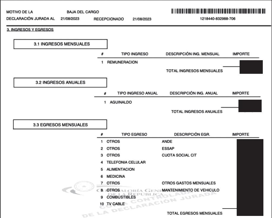 Rossana Escobar M. rossana.escobar@nacionamedia.comDel 3.1 de la sección ingresos-egresos del formulario de declaraciones juradas de la Contraloría General de la República (CGR), el expresidente de la República Mario Abdo Benítez obvió el 3.2 de ingresos anuales y pasó directamente al 3.3 de egresos mensuales. (Ver comparativo).