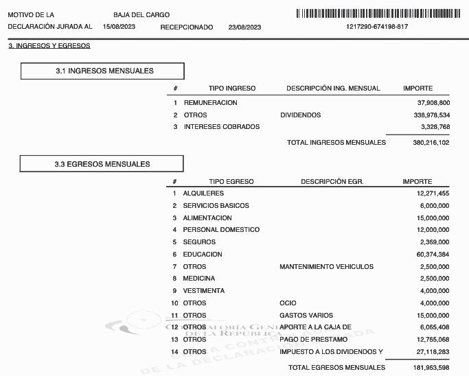 sin embargo, este ítem fue obviado en las declaraciones juradas del exmandatario. Ni el aguinaldo percibido en 2022 figura en su última manifestación de bienes al dejar el cargo y que es una retribución que los funcionarios consignan en sus respectivas manifestaciones de bienes al dejar el cargo.