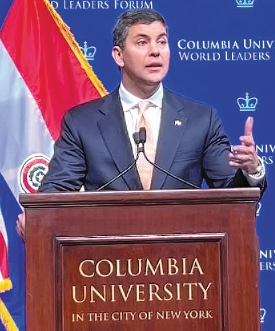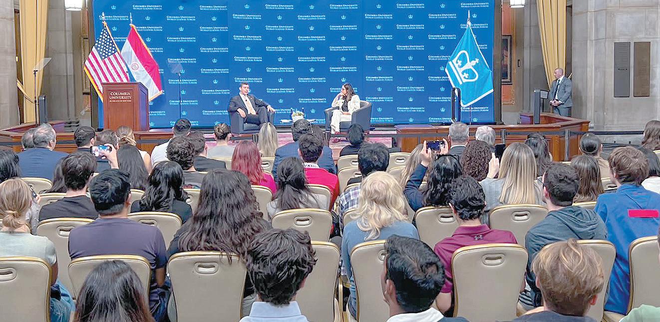 El presidente de la República, Santiago Peña, se presentó en el Foro Mundial de Líderes en la Universidad de Columbia, en EE. UU., donde habló sobre el rol de Paraguay en el crecimiento de la región y el aprovechamiento de las potencialidades para reubicarlo como una de las economías más importantes de América Latina. P. 3
