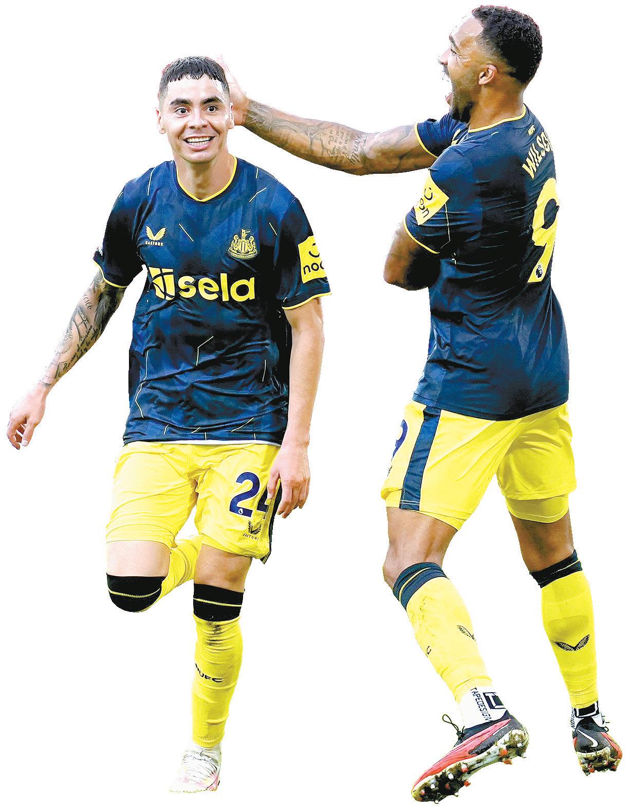 El paraguayo Miguel Almirón festeja su conquista con su compañero Wilson en el festín del Newcastle ante el Sheffield United