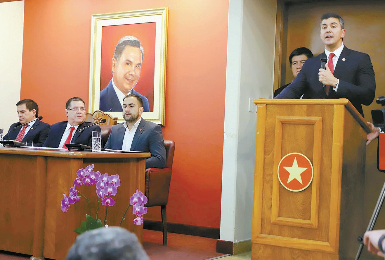Durante su ponencia, destacó que a lo largo de las tres décadas que lleva el proceso democrático, Paraguay avanzó, y no se puede desconocer que lo hizo de la mano del Partido Colorado. Asegurando que estos 35 años, la democracia ha sido el mejor sistema político, pese a sus imperfecciones. Peña remarcó que su gobierno, que arrancó el pasado 15 de agosto, inició convencido de que Paraguay tiene una gran oportunidad, la cual no se da mirando a la derecha o a la izquierda, sino mirando de frente hacia el progreso del