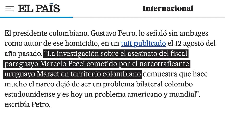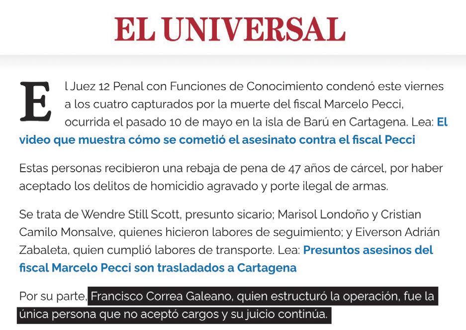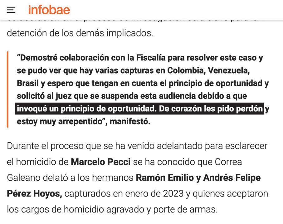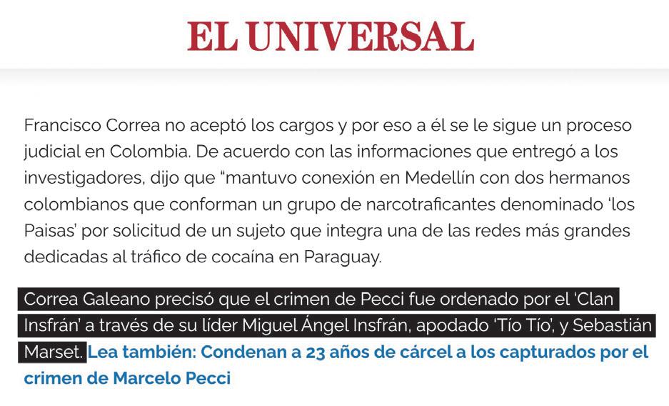 Francisco Luis Correa, señalado “cerebro” detrás del crimen del exfiscal Marcelo Pecci, había declarado que la orden provino del líder del clan Insfrán y el uruguayo Sebastián Marset, vinculados al esquema narco que quedó al descubierto con el megaoperativo A Ultranza Py. Al año del terrible suceso, el hombre que coordinó el atentado ajustó su versión sobre los hechos y por un principio de oportunidad está a punto de evitar la extradición y una pena de entre 40 y 50 años de prisión que corresponden al castigo ejemplar que había solicitado inicialmente la Fiscalía colombiana.