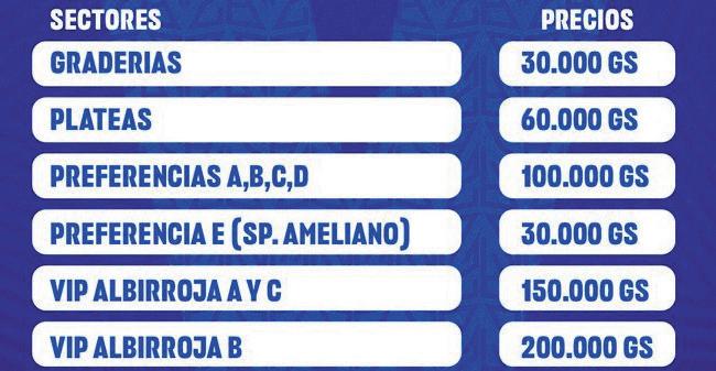 El club dio a conocer el precio de las entradas para su partido de Copa dio a conocer ayer martes los precios de las entradas para ese partido (ver foto), con precios que van desde los G. 30.000 (graderías) y 200.000 (Vip Albirroja). Las mismas ya se venden a través de la Red UTS.