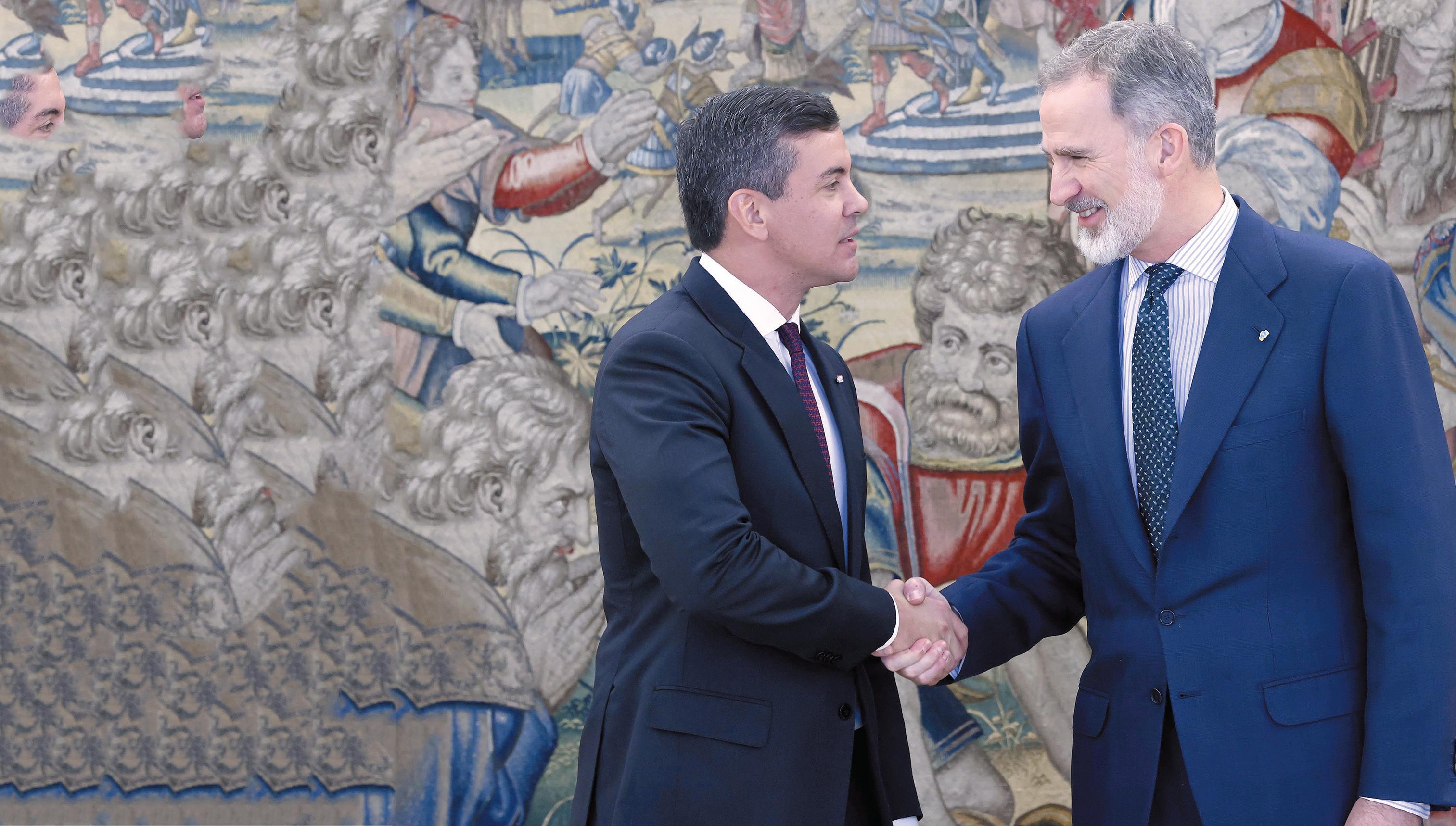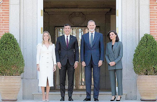 El presidente de la República, Santiago Peña, culminó su visita oficial a España con una audiencia con el rey Felipe VI y la reina Letizia Ortiz en el Palacio de la Zarzuela, acompañado de la primera dama Leticia Ocampos. Horas antes, el mandatario también mantuvo un encuentro oficial con el presidente del Gobierno español, Pedro Sánchez. P. 3