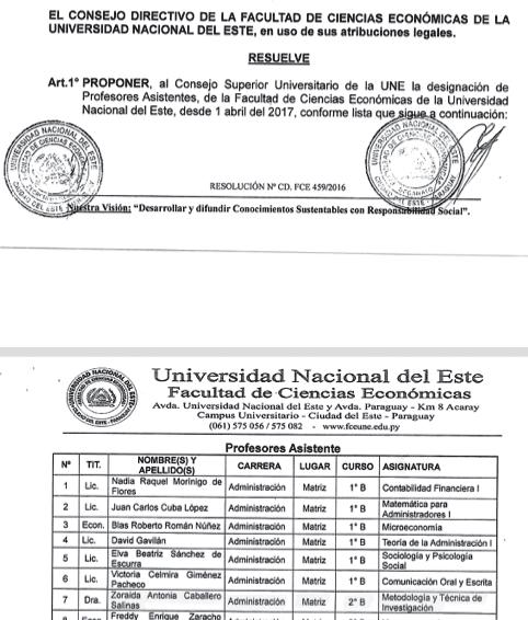 Entre la lista de candidatos que el Consejo Directivo de la Facultad de Ciencias Económicas (FCE) propuso al Consejo Superior Universitario figura Elva Beatriz Sánchez, esposa del decano de la FCE; Carlos Escurra Benítez, que consiguió el rubro de profesora asistente de la asignatura Sociología y Psicología Social para el primer curso sección B de la carrera de Administración.
