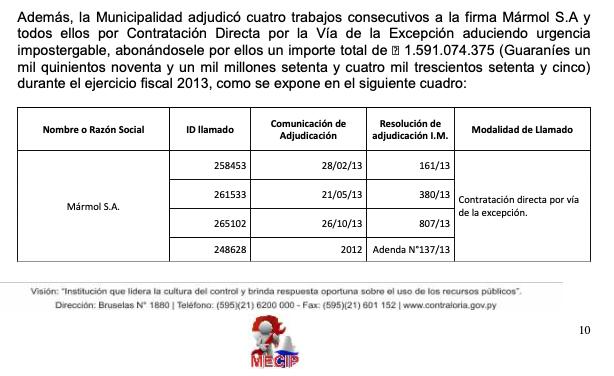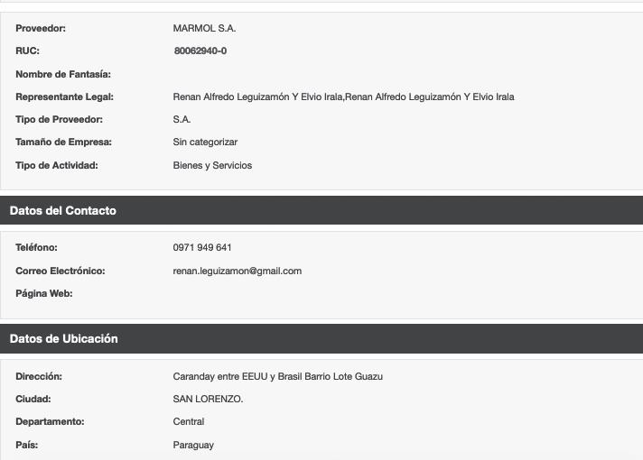 Mármol SA, empresa contratista que acaparaba construcción y refacción de escuelas de forma directa en Villa Elisa durante la administración del hoy senador liberal Líder Amarilla y a la que se lo vinculaba desde siempre, operaba en dirección correspondiente al inmueble adquirido por el jefe comunal; contratos firmados, resoluciones de adjudicación así consignan. El mismo portal de la Dirección de Contrataciones Públicas todavía registra domicilio de la proveedora en propiedad del político. No es un dato menor que tras ubicarse como intendente Amarilla potenció sus finanzas.