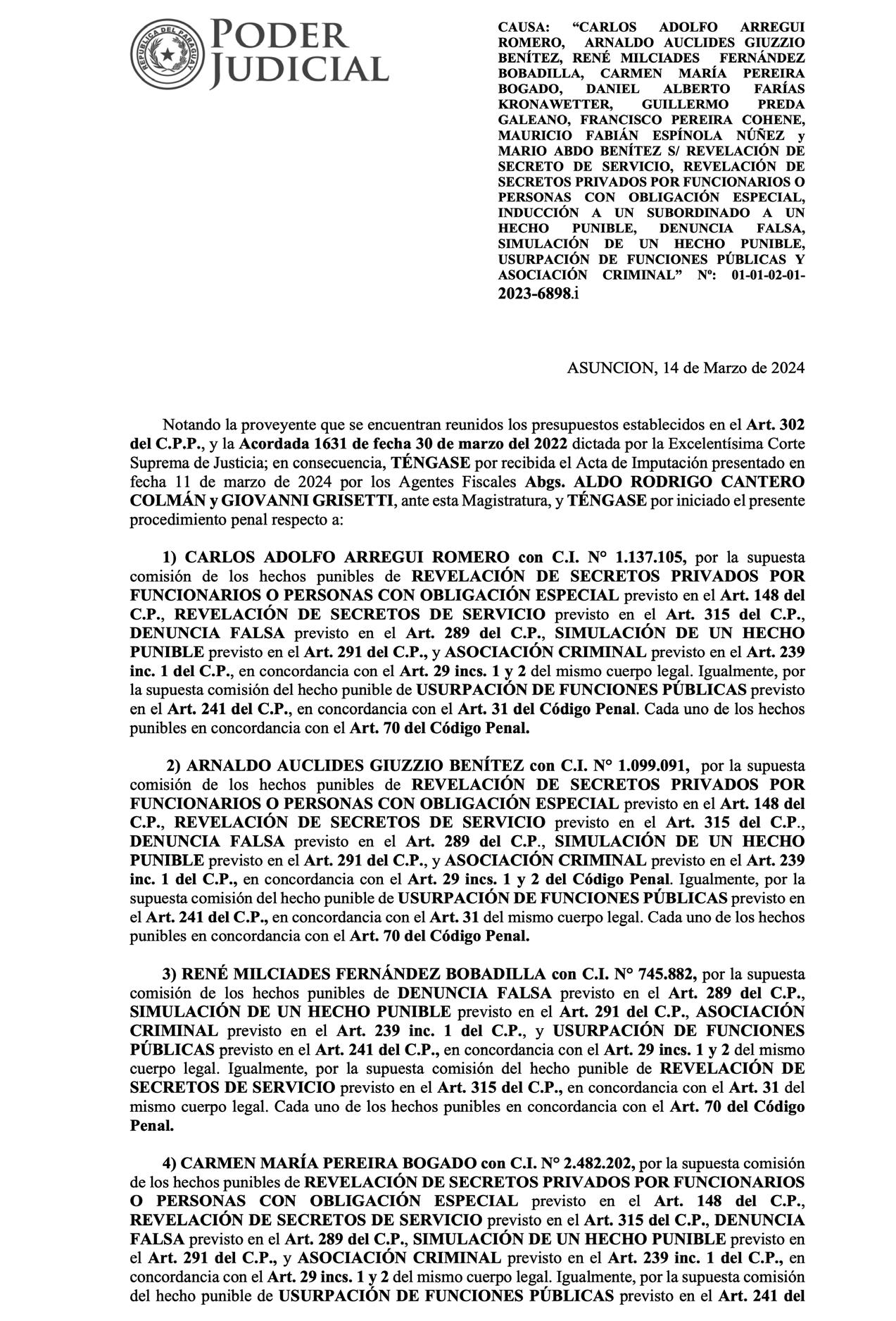 La medida afecta a Carlos Arregui, Arnaldo Giuzzio, René Milciades Fernández, Carmen Pereira, Daniel Farías Kronawetter, Guillermo Preda y Francisco Pereira. Para Mario Abdo Benítez y Mauricio Espínola se remitió pedido de desafuero al Senado y a Diputados, respectivamente. Una vez desaforados se admitirá imputación y fijará audiencia.