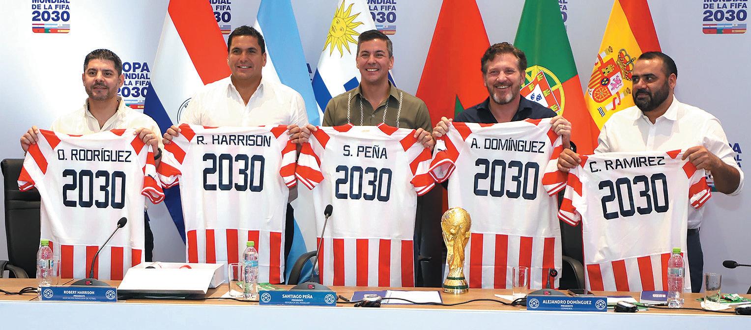 El presidente de la República, Santiago Peña, y de la APF, Robert Harrison, junto al titular de la Conmebol, Alejandro Domínguez