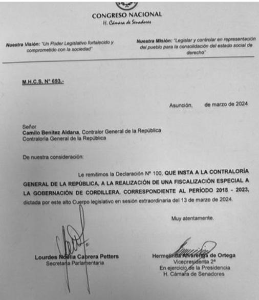 auditar la gestión del exgobernador de Cordillera y actual presidente de los azules, Fleitas, ante denuncias de supuestos casos de corrupción.