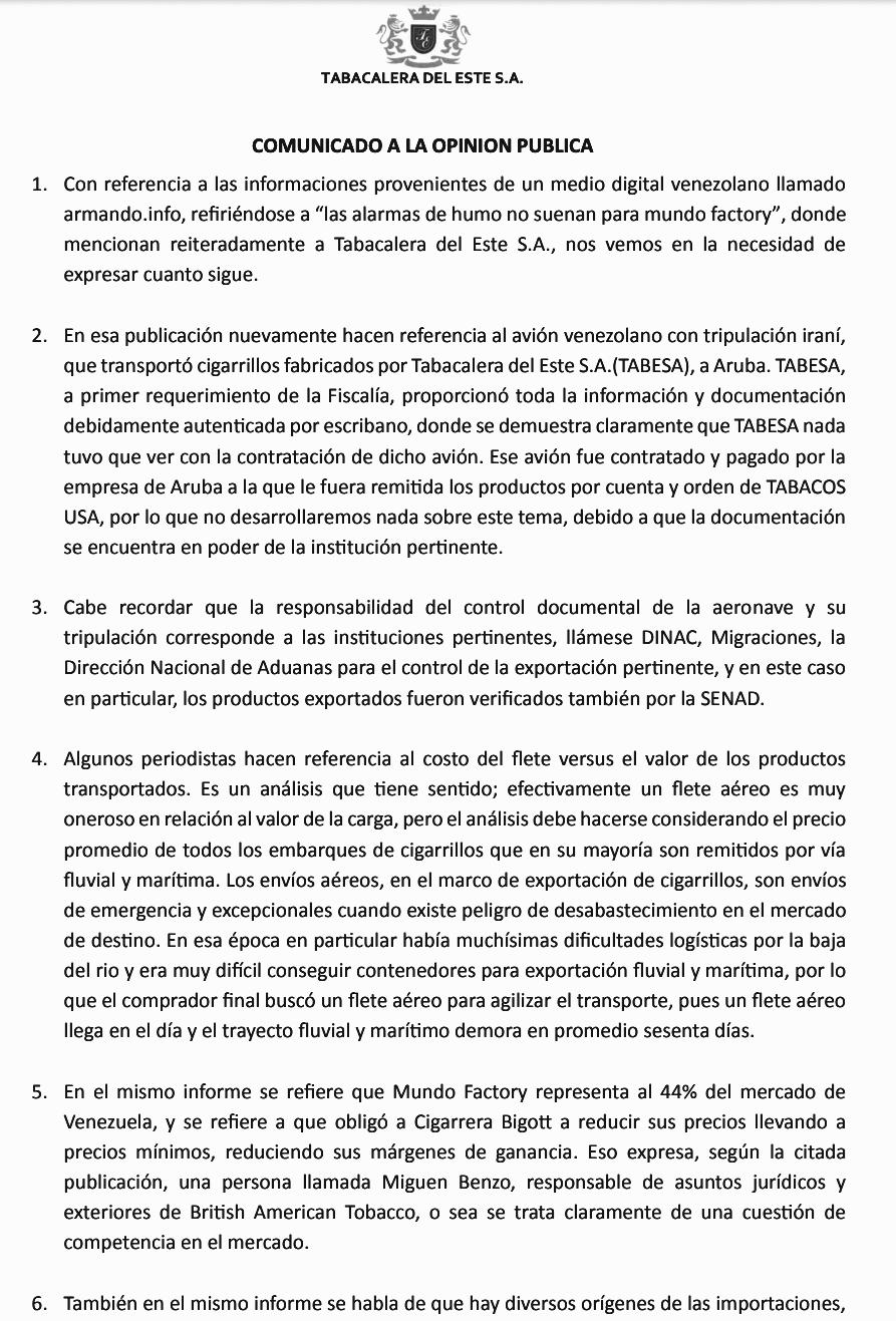 La empresa Tabacalera del Este SA (Tabesa) emitió un comunicado sobre la publicación del medio venezolano armando.info, que fue replicada localmente, poniendo a conocimiento de la ciudadanía su versión sobre lo divulgado. El documento está consignado por el Directorio de la empresa.