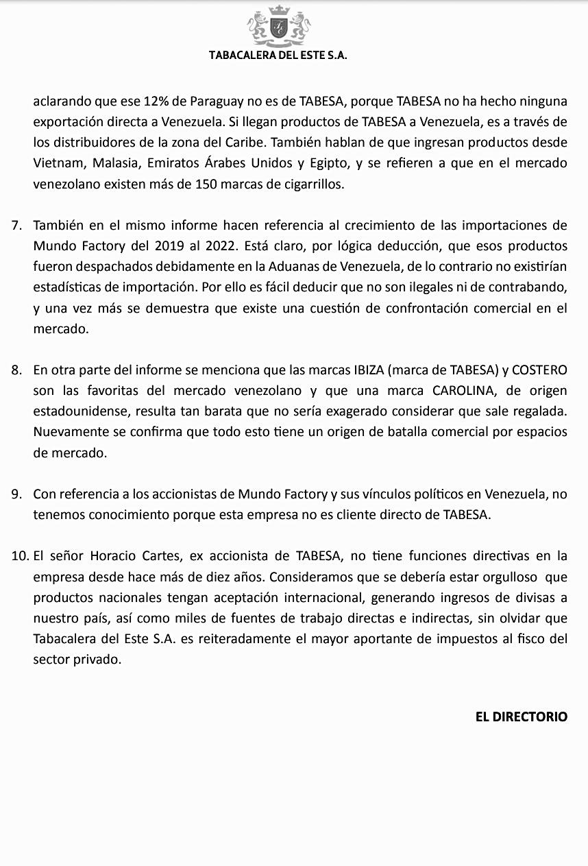 “En esa publicación nuevamente hacen referencia al avión venezolano con tripulación iraní, que transportó cigarrillos fabricados por Tabacalera del Este SA (Tabesa), a Aruba. Tabesa, a primer requerimiento de la Fiscalía, proporcionó toda la información y documentación debidamente autenticada por escribano, donde se demuestra claramente que Tabesa nada tuvo que ver con la contratación de dicho avión. Ese avión fue contratado y pagado por la empresa de Aruba a la que le fuera remitida los productos por cuenta y orden de Tabacos USA, por lo que no desarrollaremos nada sobre este tema, debido a que la documentación se encuentra en poder de la institución pertinente”.
