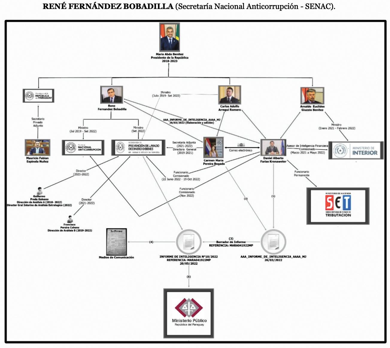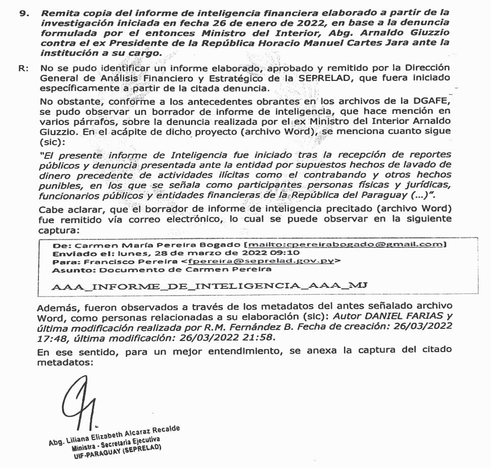 calía, Daniel Farías Kronawetter (asesor de inteligencia financiera del ministro del Interior, Arnaldo Giuzzio, comisionado recién a partir de junio de 2022 a la Seprelad) y René Fernández, entonces ministro de la Secretaría Nacional Anticorrupción, ambos sin ser funcionarios de la Seprelad, habrían elaborado el borrador (documento Word) que sirvió para hacer el posterior informe confidencial filtrado a la prensa.
