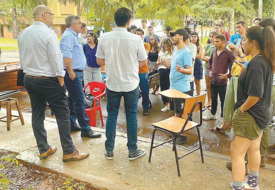 El ministro de Educación, Luis Fernando Ramírez, acompañado de los viceministros, Federico Mora (de Educación Superior) y Óscar Lovera (Administración Financiera del Ministerio de Economía y Finanzas), llegaron hasta el local de la Universidad Nacional de Asunción (UNA), con el fin de buscar un diálogo más abierto y directo con un grupo de estudiantes universitarios, quienes están en desacuerdo con las negociaciones, en reclamo de garantías por la financiación de la Ley Arancel Cero.
