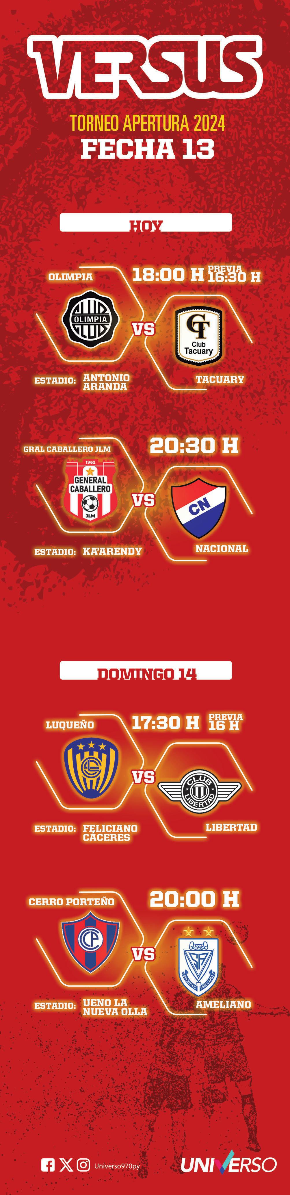 También en el Este del país, General Caballero y Nacional se sacarán chispas en un duelo de rezagados en el campeonato. El cuadro esteño está metido en la zona de descenso, mientras que la Academia, si bien por ahora está lejos de la línea roja, se encuentra actualmente en la cola del torneo Apertura. Atendiendo la situación de ambos equipos, el triunfo es impostergable para los dos clubes.