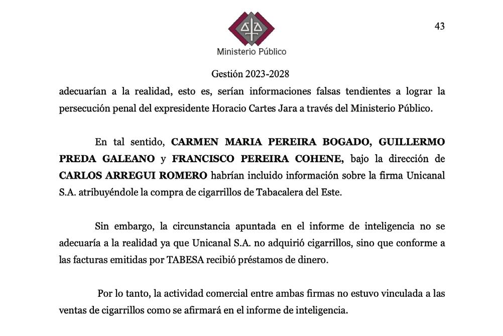 En tal sentido, en el acta de imputación se sostiene lo siguiente: “En tal sentido, CARMEN MARÍA PEREIRA BOGADO, GUILLERMO PREDA GALEANO y FRANCISCO PEREIRA COHENE, bajo la dirección de CARLOS ARREGUI ROMERO, habrían incluido información sobre la firma Unicanal SA atribuyéndole la compra de cigarrillos de Tabacalera del Este. Sin embargo, la circunstancia apuntada en el informe de inteligencia no se adecuaría a la realidad ya que Unicanal