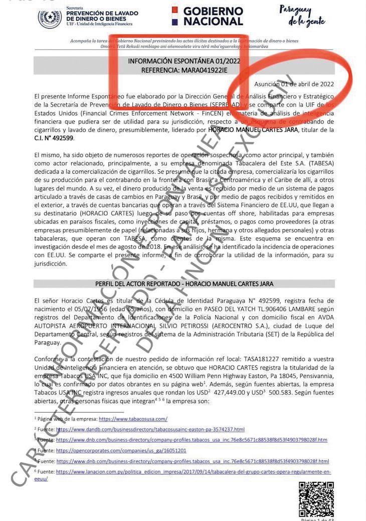 La asociación criminal, encabezada por Abdo y montada desde la Seprelad, se encargó de armar y enviar al Gobierno de Estados Unidos un informe fraguado con el objetivo de provocar sanciones contra Horacio Cartes y sus empresas. P. 3