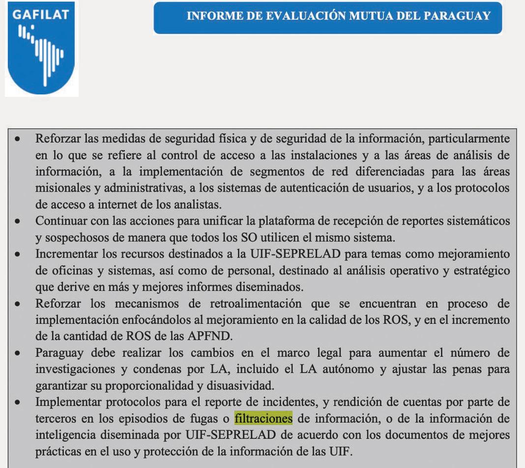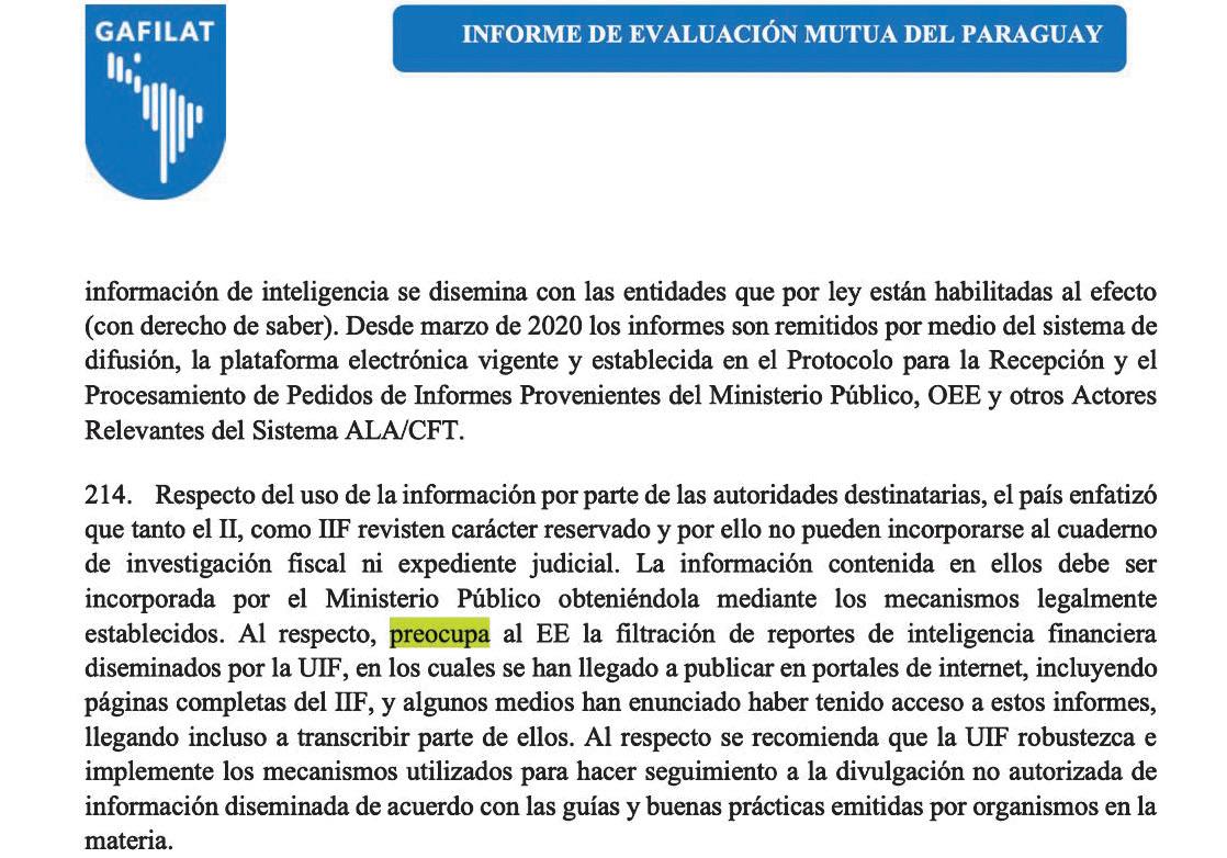 En su informe de evaluación mutua a Paraguay del Grupo de Acción Financiera de Latinoamérica, en el mes de setiembre de 2022, año en el que se registró la mayor cantidad de filtraciones de informes confidenciales desde la Seprelad, se consignó lo siguiente: “Respecto del uso de la información por parte de las autoridades destinatarias, (…) preocupa al equipo evaluador la filtración de reportes de inteligencia financiera diseminados por la Unidad de Inteligencia Financiera - UIF, en los cuales se han llegado a publicar en portales de internet, incluyendo páginas completas del informe de inteligencia, y algunos medios