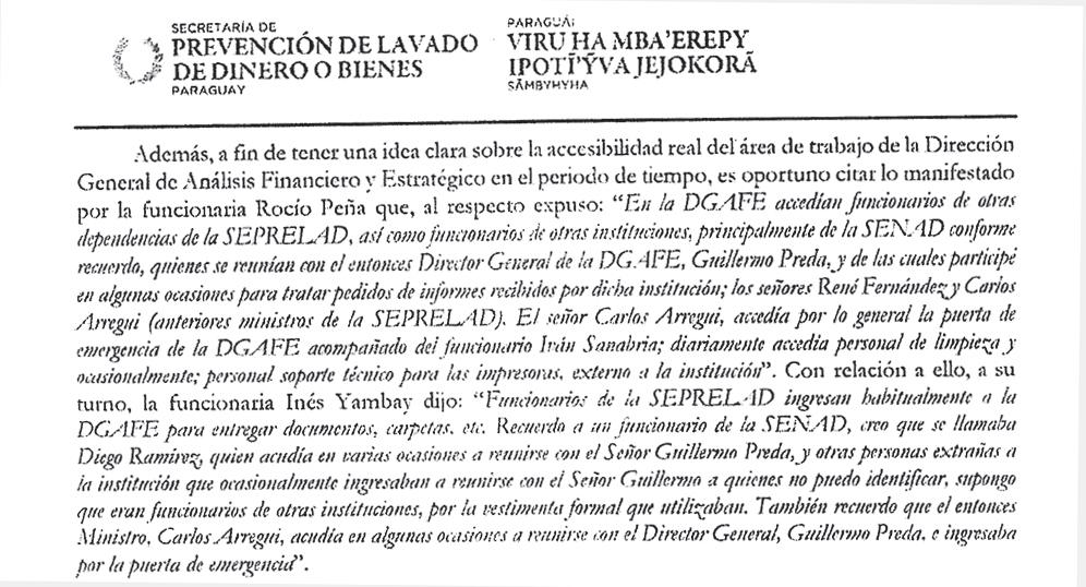 En ese sentido, consta en el documento final de la auditoría, remitido al Ministerio Público, el testimonio de la funcionaria Rocío Peña, directora interina de la Dirección de Análisis Financiero, quien expresamente señaló lo siguiente: “En la DGAFE accedían funcionarios de otras dependencias de la Seprelad, así como de otras instituciones, principalmente de la Senad quienes se reunían con el entonces director Guillermo Preda, René Fernández y Carlos Arregui”.