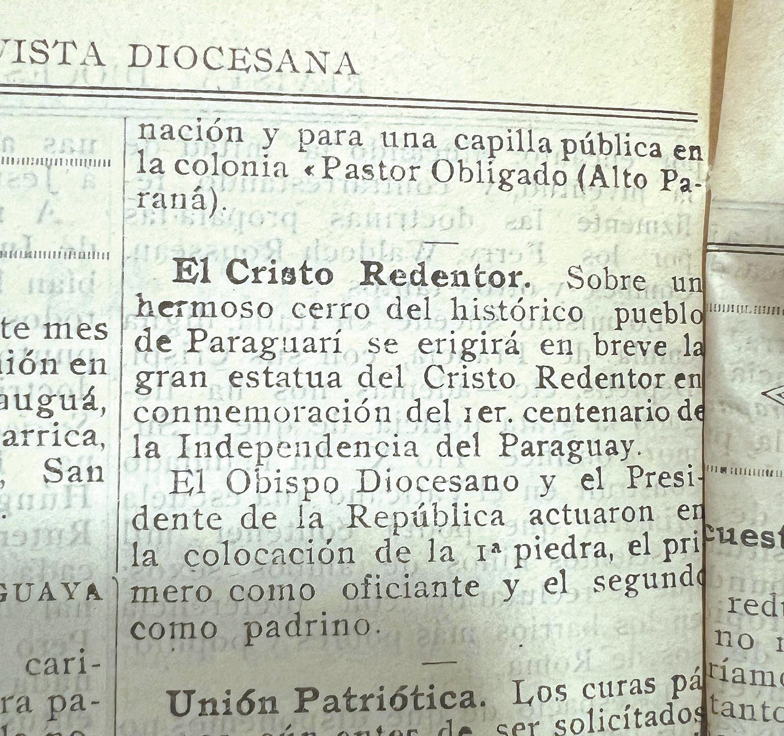Hallaron vestigios de lo que habría sido el Cristo Redentor del Paraguay Una de las etapas menos estudiadas de la historia paraguaya son los festejos y acciones que se llevaron adelante por el centenario de la Independencia nacional. En esta entrevista con La Nación/ Nación Media, el historiador y arqueólogo Néstor Gamarra brinda detalles de una investigación que llevó al hallazgo de restos de una escultura del Cristo Redentor en un cerro homónimo de Paraguarí. P. 28-29