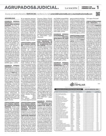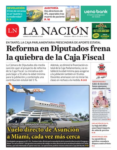 TEL: 959-3000 MAIL: DIRECCION@NACIONMEDIA.COM | WWW.LANACION.COM.PY LA NACIÓN es una publicación de Gráfica y Editorial Intersudamericana S.A. · Dirección: Avda. Zavala Cué e/ 2da. y 3ra. - Fernando de la Mora, Zona Sur. · Luque: Cerro Corá 242 Teléfono: 643 129 · San Lorenzo: Mcal Estigarribia 2373 c/ Rodríguez de Francia. Teléfono: 583 594 · Concepción: Pdte. Franco esq. Yegros, Galería Asunción. Telefax: 0971 811 295 · Encarnación: Mons. Wiessen c/ Mcal. Estigarribia. Teléfono: 071 205 527/8 · San Ignacio, Misiones: Yegros 663 Teléfono: 082 232 406 · Coronel Oviedo: Mcal. Estigarribia c/ Tuyutí. Teléfono: 0521 203 524 · Ciudad del Este: Curupayty e/ Adrián Jara. Teléfono: 061 510 930 · Suscripciones: 959-3190 · Fonoavisos: 959-3161