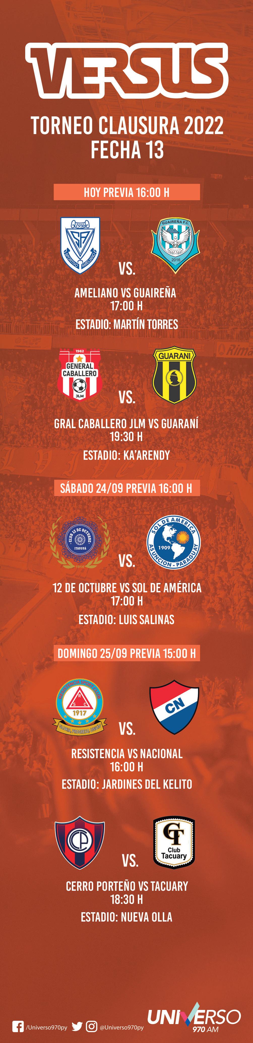 Se pone en marcha hoy la fecha 13 del torneo Clausura con dos partidos. En el juego de fondo, Guaraní, que viene de dos triunfos consecutivos, el último por 2-1 en el clásico más añejo sobre Olimpia, se traslada hasta el Este del país para visitar al General Caba llero en Juan León Mallor Elquín.conjunto