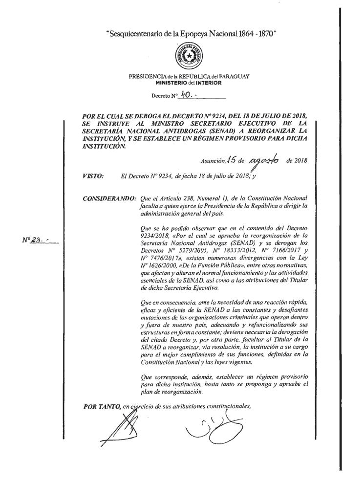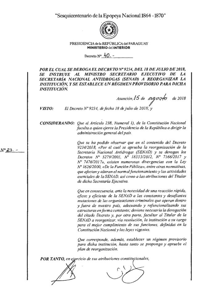 Es relevante mencionar que la resolución para levantar las bases de control de los puertos con la eliminación de la unidad de acción en ter minales portuarias estuvo basada en el Decreto Nº 40 del Poder Ejecutivo, que el presidente de la República, Mario Abdo Benítez, firmó el 15 de agosto del 2018, el