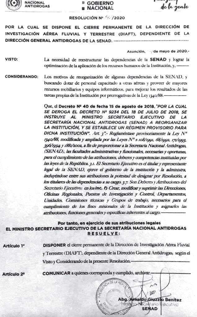 La Dirección de Inteli gencia Aérea Fluvial y Terrestre (DIAFT) de la Secretaría Nacional Anti drogas (Senad) fue desarti culada por una resolución del ex ministro de la institución Arnaldo Giuzzio en mayo del