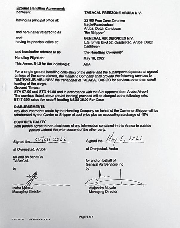 Tabacal Free Zone NV contrata los servicios de General Air Services NV para realizar el transporte de la mercadería y esta señala que lo realizará con la empresa Emtrasur Airlines.