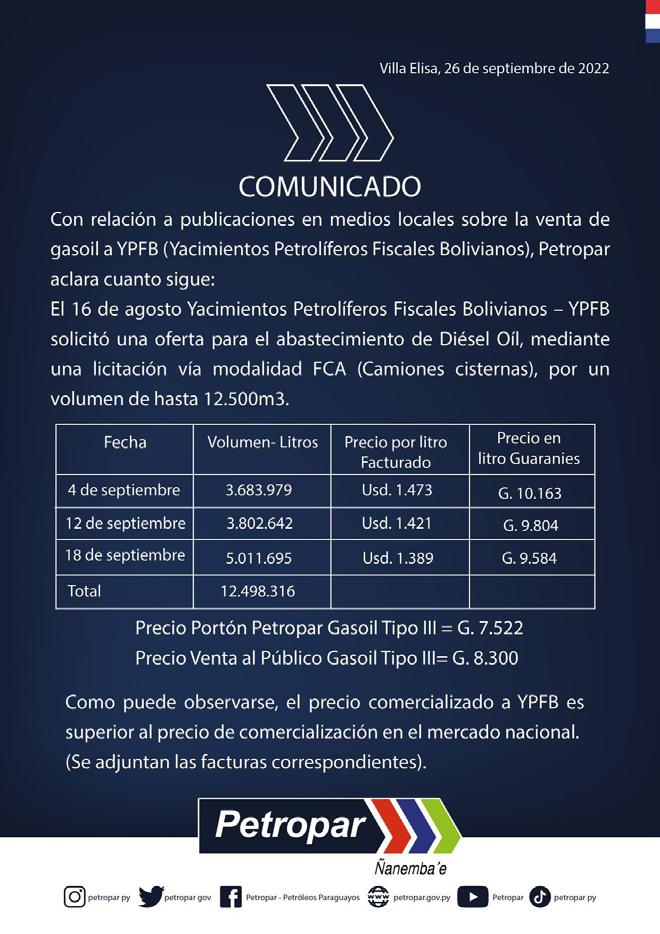 La empresa estatal Petró leos Paraguayos SA (Petro par) lanzó un comunicado ante las reveladoras publi caciones que alegaban que estaban vendiendo com bustible más barato a la petrolera estatal boliviana que a la ciudadanía para guaya.