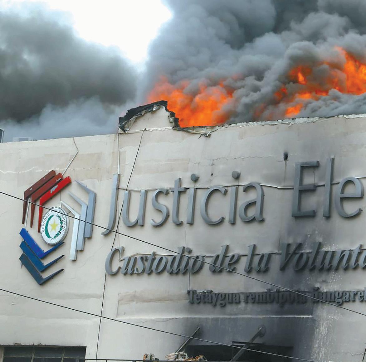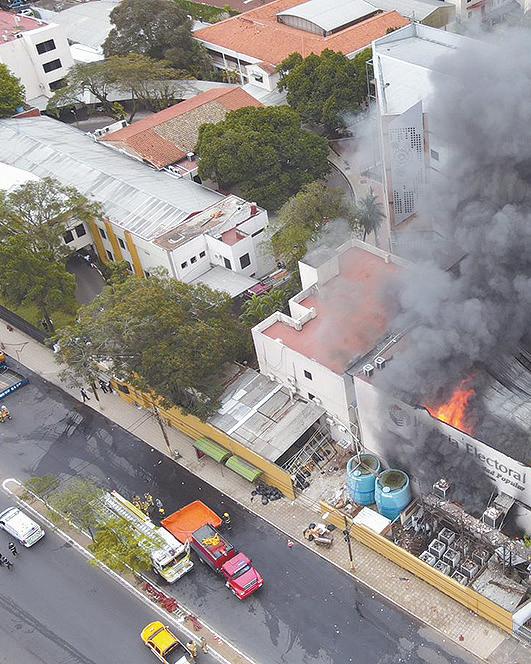 Un repentino y feroz incendio desatado en la siesta de ayer jue ves, consumió totalmente un bloque del edificio del Tribunal Superior de Justi cia Electoral en la capital del país y movilizó a los diferen tes cuerpos de bomberos de la ciudad y alrededores, amena zando con desplazarse hacia otros bloques del predio.