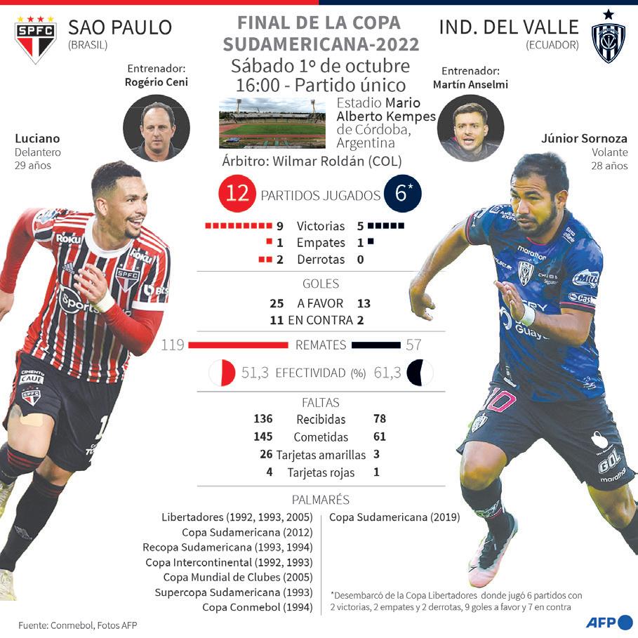 El brasileño Sao Paulo y el ecuatoriano Independiente del Valle se ven cara a cara por primera vez en su his toria hoy para disputarse la corona de la Copa Sudameri cana 2022 en la ciudad argen tina de Córdoba.