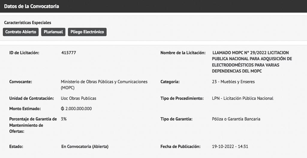 El MOPC publicó un llamado para adquirir electrodomésticos, pero no se detalla cantidad a ser requerida porque adjudicación es por contrato abierto.
