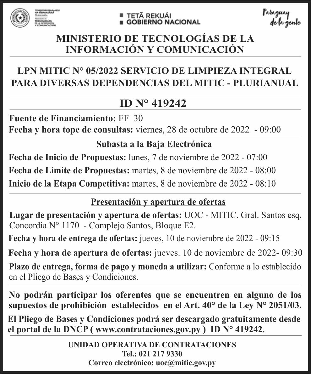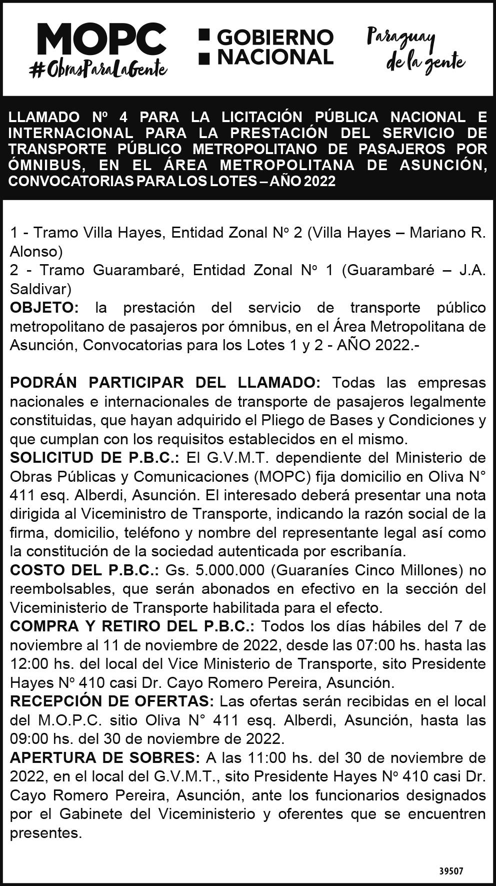 Por último, el MOPC estable ció el martes 15 de noviembre como fecha para la apertura de sobres de oferta, a poco menos de un mes del desa rrollo de las internas parti darias rumbo a las elecciones generales del 2023.