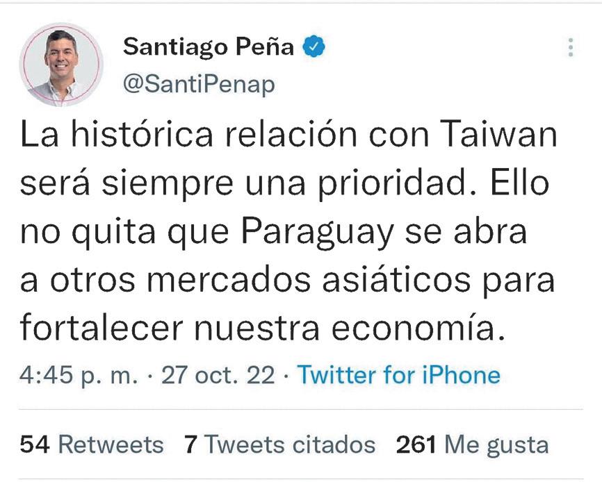El precandidato a presi dente de la República Santiago Peña reiteró en su cuenta de Twitter que la relación con la República de China (Taiwán) primará durante su gestión. “La his tórica relación con Taiwán será siempre una prioridad. Ello no quita que Paraguay se abra a otros mercados asiáti cos para fortalecer nuestra economía”, aseguró el pre sidenciable en su red social.