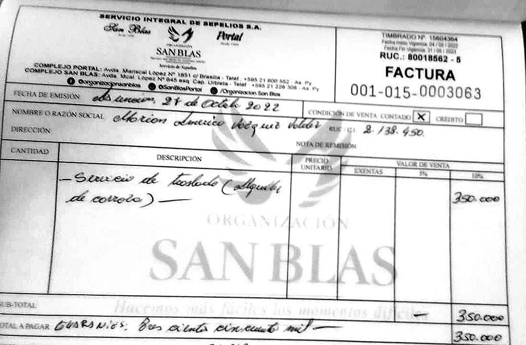 La factura por el servicio del traslado del féretro del comandante del EPP al Buen Pastor salió a nombre de la ex directora del Buen Pastor, que al parecer actuó por orden de Édgar Taboada y el propio nuevo titular de Justicia, Daniel Benítez.